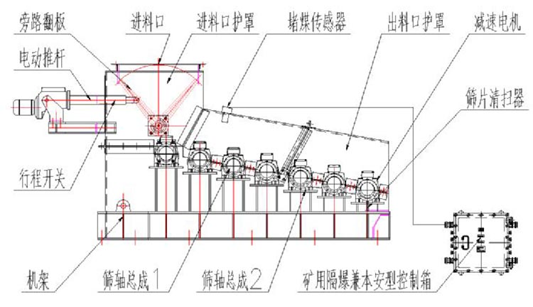 其筛轴转速可通过变频调速器改变电机转速而实现无级调速。筛机可在滚动筛的入口端增装电动推杆机构控制切换挡板;煤流既可经过筛分,又可经挡板切换流向旁路通过。