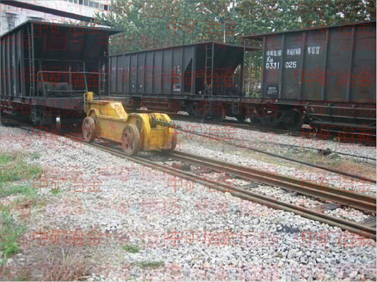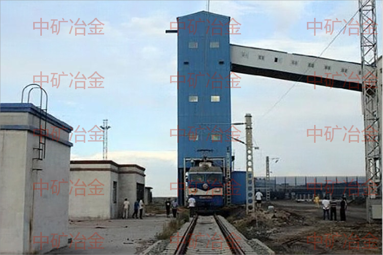 火车装车站的装载过程有两种情况,第一种模式在坑口矿山火车的装载方式与上面的汽车装载方式类似,在料仓下方安装有溜槽闸门,当火车到位后,操作间工人下放溜槽闸门开始装料,在堆料达到火车箱体高度的时候,人工观察后提醒司机,通过铁牛牵引,火车逐步移位,确保车厢内原料堆满后,溜槽闸门收起,进行下一节火车的装载。另外一种模式就是采用料斗秤式火车装载,即建有大型火车装载站,将物料输送至料斗秤内,当达到火车装载额定吨位后,停止物料输送,待火车到位后,打开料斗秤下方的鄂式闸门,进行物料装载。