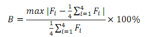 根据规定,任一根钢丝绳的张力与平均张力之差不得超过±10%,若测得不平衡度大于10%,则认为提升系统出现张力不平衡故障。假设各钢丝绳实时张力依次为F1、F2、F3、F4,则张力不平衡度B计算公式为: